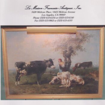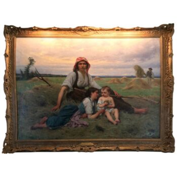 traveling in the desert looking into the pink glow of the sun. In gilt frame. which depicts a group of people in the distance around their