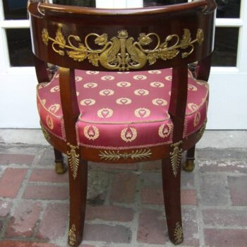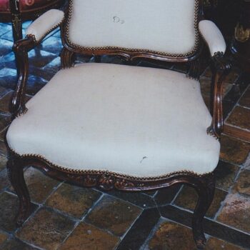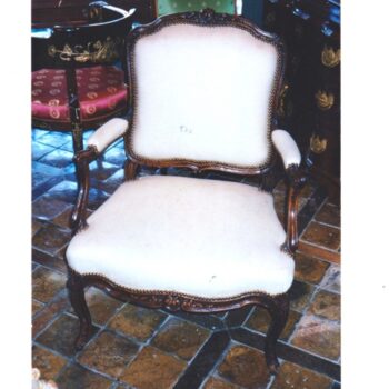 Height: 35″  Width: 23″  Depth: 24″  Pair Antique Armchairs Louis XVI Fauteuils in Walnut Dining Entrance Side chairs .Two chairs out of a (Set of Six total) important 18th century Louis XVI of the Period French Chairs. Carved beautifully in Walnut and a fantastic patina .  Upholstered in light cream and blue fabric . Each […]