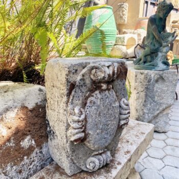 An imposing pair to define an entrance of a garden, you can mount a light lantern. could use the columns or pillar around the pool as architectural element decorative. Antiques dealer Los Angeles CA West Hollywood Beverly Hills La Cienega Blvd. Melrose ave landscape design decor. To elevate your outdoor seating area this beautifully carved gigantic size Stone base will be the perfect choice. Very nice Patina over the centuries have some chips losses cracks as expected and variation with color and patina over the seasons.