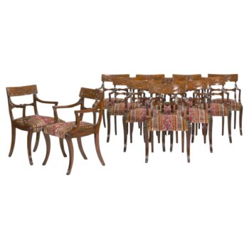 Rare Full Set Of 12 Regency Period Carved Mahogany Elbow Dining Armchairs Seats