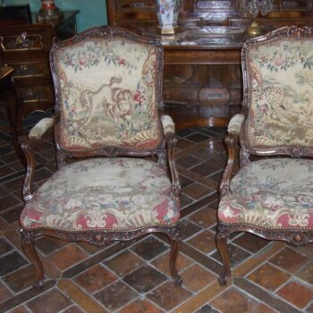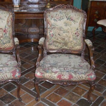 Height: 38″  Width: 22″ Depth: 17″  Pair 17th Century Louis XIII Period Dining Room side hallway Chairs hand carved . Three pairs available or a set of six chairs of the 17th century French carved walnut armchair Louis XIII of the period with handsomely turned front legs and stretchers. The chairs features later upholstery with […]